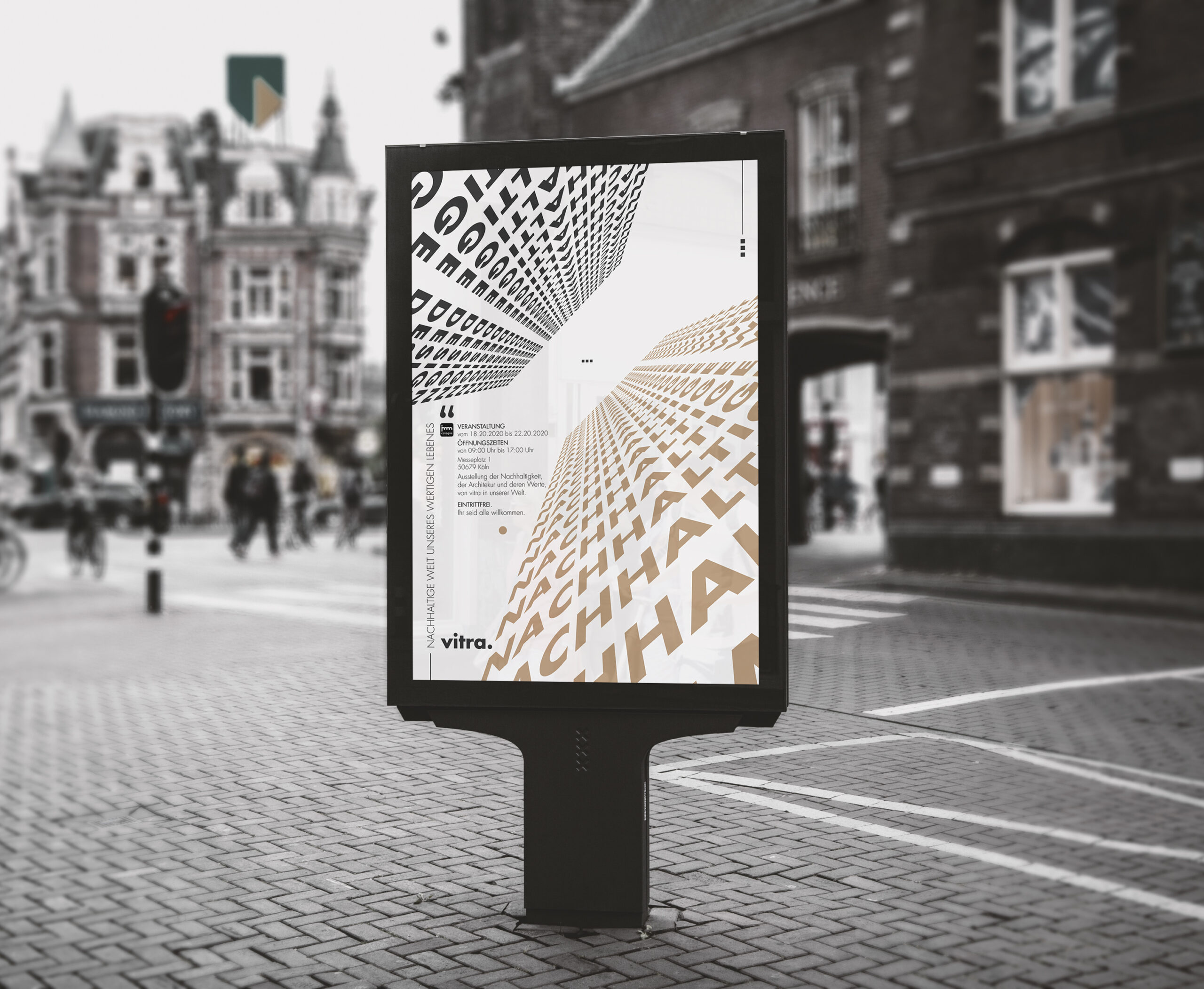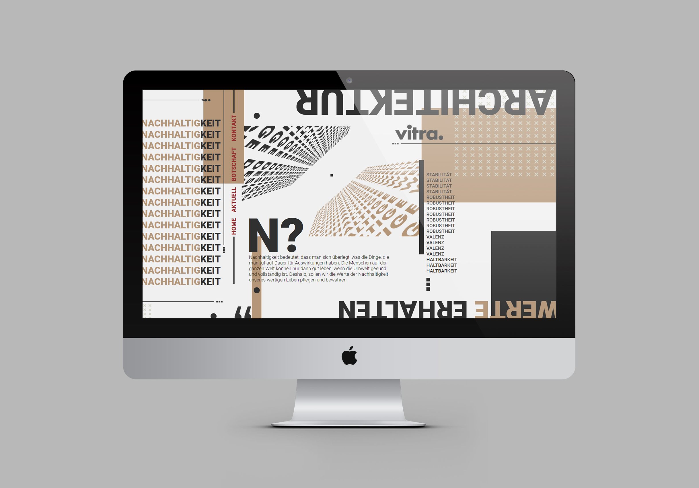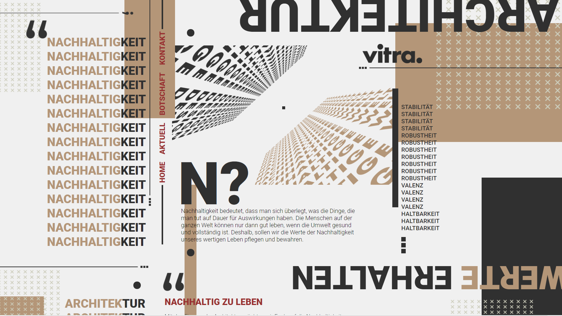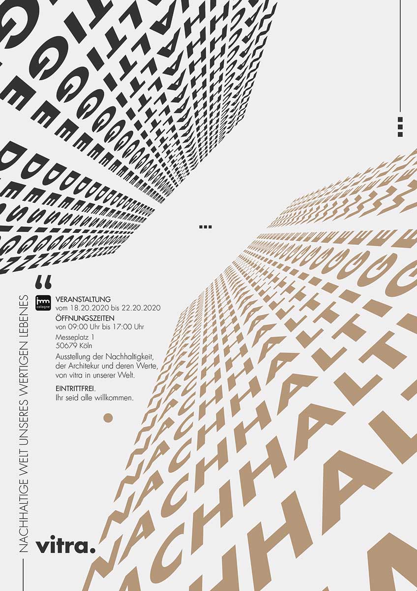 Die Marke „Vitra“ ist eine international bekannte Marke, die für hochwertiges Design, Möbel und Accessoires steht. Das Unternehmen ist besonders für seine Zusammenarbeit mit renommierten Designern und Architekten bekannt und steht für Innovation, Qualität und Nachhaltigkeit. Das visualisierte Designkonzept ist zeitgenössisch mit Fokus auf Klarheit, Struktur und visuelle Prägnanz. Es bilden architektonische Strukturen. Es ist klar moderne, minimalistische. Es wirkt zeitgenössisch, sachlich sowie zeitlos und professionell. Sie vermittelt Werte wie Stabilität, Nachhaltigkeit und Innovationskraft.